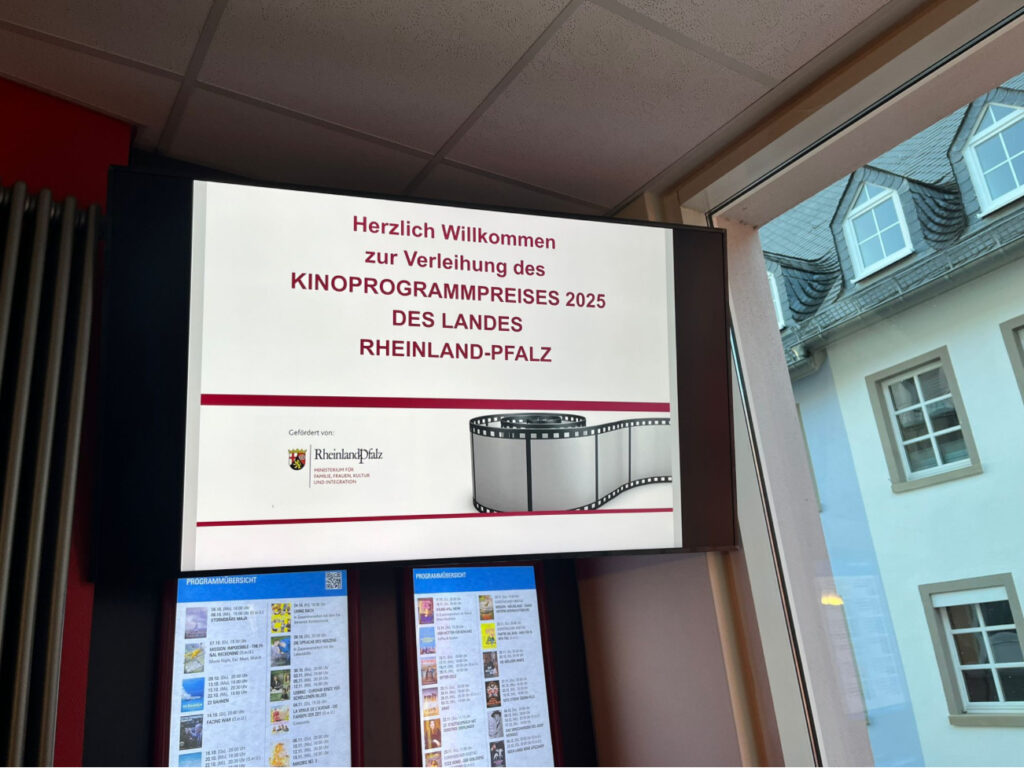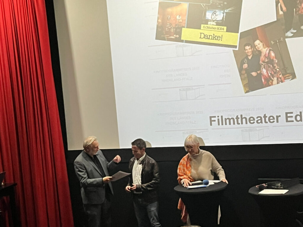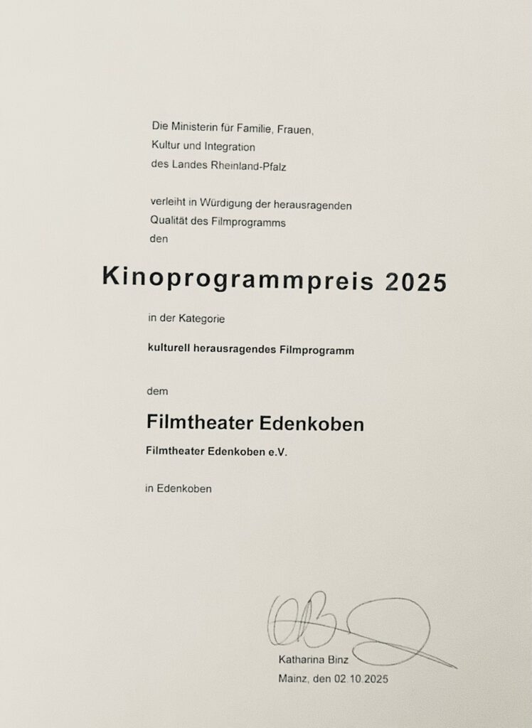 Gestern, am 2. Oktober 2025, wurde dem Filmtheater Edenkoben vom Land Rheinland-Pfalz in Würdigung der herausragenden Qualität des Filmprogramms der Kinoprogrammpreis 2025 in der Kategorie kulturell herausragendes Filmprogramm verliehen.